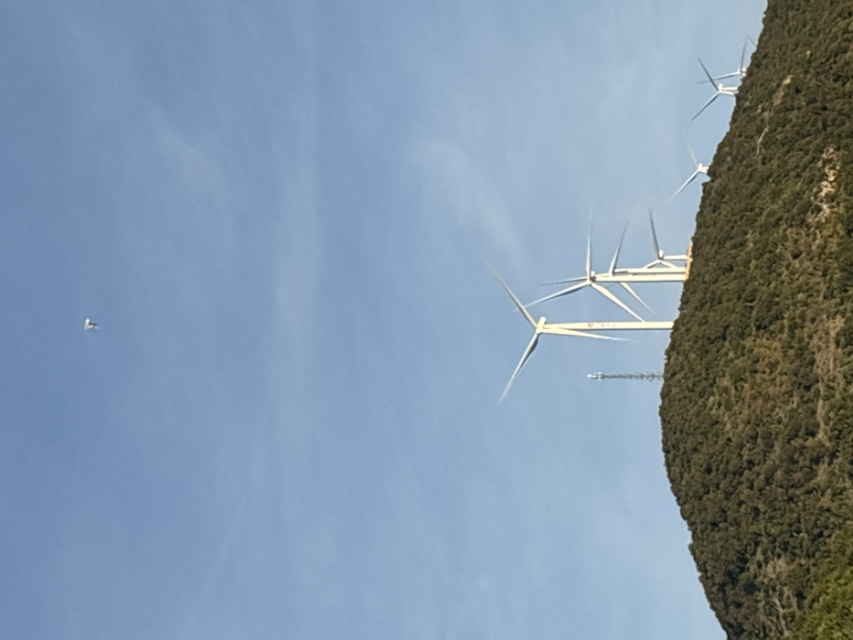 The image displays an outdoor scene in Kruče - Kërruçi, Montenegro. A clear, light blue sky dominates the upper portion, with a high-altitude paraglider visible in the upper-center, featuring a white canopy. The lower half of the image is occupied by a large, undulating hill or mountain ridge, densely covered with dark green foliage. Positioned along the crest of this ridge is a line of at least seven white wind turbines, varying in size and distance, with the largest and closest appearing on the left side of the ridge. The blades of these turbines are visible; some exhibit a slight blur consistent with rotation. To the left of the prominent wind turbines, a slender, dark-colored lattice communication tower stands on the ridge. The scene is illuminated by natural daylight.