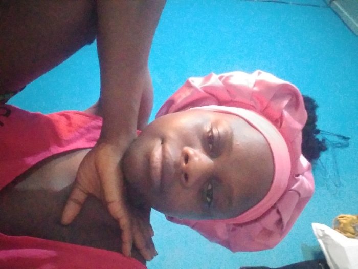 An individual is depicted indoors in Ipetumodu, Nigeria. The subject, a person with dark skin, faces the camera directly with a neutral expression. They are wearing a pink satin bonnet or sleep cap over their head, secured with a lighter pink headband, and a v-neck top in a dark pink or red hue. The subject's left arm is bent, with the hand resting on their right shoulder. The right arm is also bent, appearing positioned behind the head or neck. The background consists of a solid bright turquoise wall. In the upper right corner, indistinct dark fabric or objects are visible. The upper left corner shows a white object, possibly an air conditioning unit or shelf, mounted on the wall.