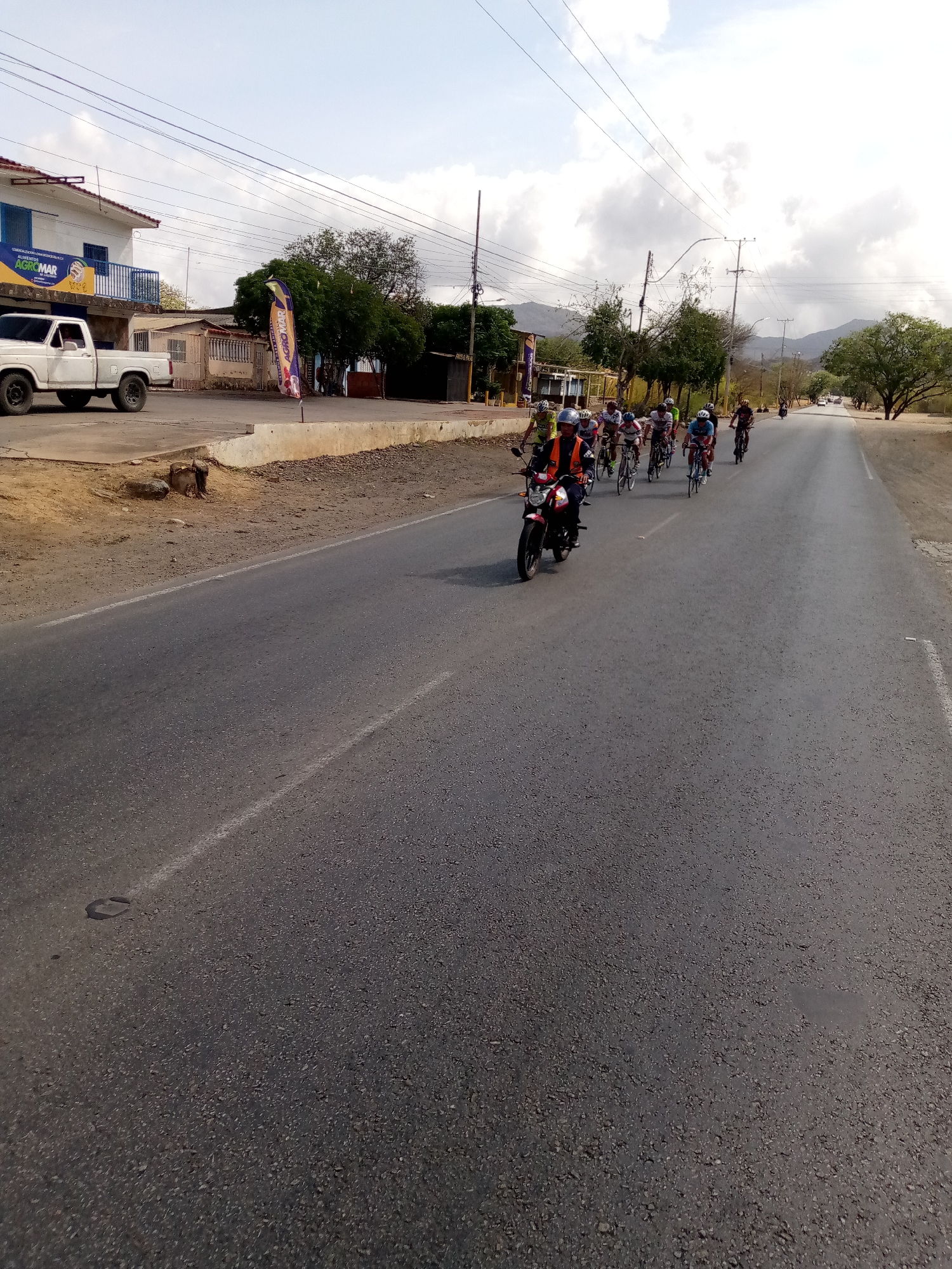 A group of cyclists is traveling on a road outside San Juan Bautista, Venezuela. The road is paved and there are trees and mountains in the background. The weather is sunny and partly cloudy. A motorcycle leads the group. A white pickup truck is parked next to a white building in the background.