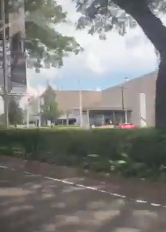 From a low angle behind glass, a vehicle drives alongside a highway with buildings and trees in the background