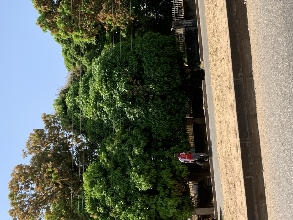 The image depicts an outdoor scene in Maiburiji, Nigeria, under a clear blue sky. In the foreground, a paved asphalt road extends across the bottom, separated by a concrete curb from a dry, light-brown earthen median strip. Beyond this strip is another paved surface where a single male individual is walking from left to right. He wears a red and white short-sleeved jersey, light-colored trousers, carries a dark bag in his left hand, and a light-blue object in his right hand. Behind the pedestrian, a line of tall, densely foliated trees dominates the midground and background, exhibiting various shades of green, with some patches of reddish-brown foliage. Multiple thin utility wires are strung horizontally across the scene, passing through and above the tree canopy. A low concrete wall topped with a white metal fence or railing is visible beneath the trees in the midground, bordering the paved area where the individual is walking. Sunlight suggests a daytime setting.