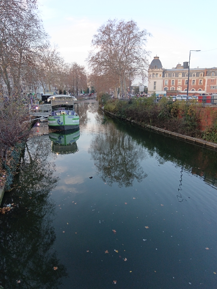 A canal filled with dark water reflects bare trees and a building in the distance. A tour boat with lights is docked to the left. Leaves float on the water's surface. Vegetation lines the canal's edge on the right side, transitioning to a red brick wall with a metal railing. A streetlamp and a building with a domed roof can be seen in the background. The sky is overcast.