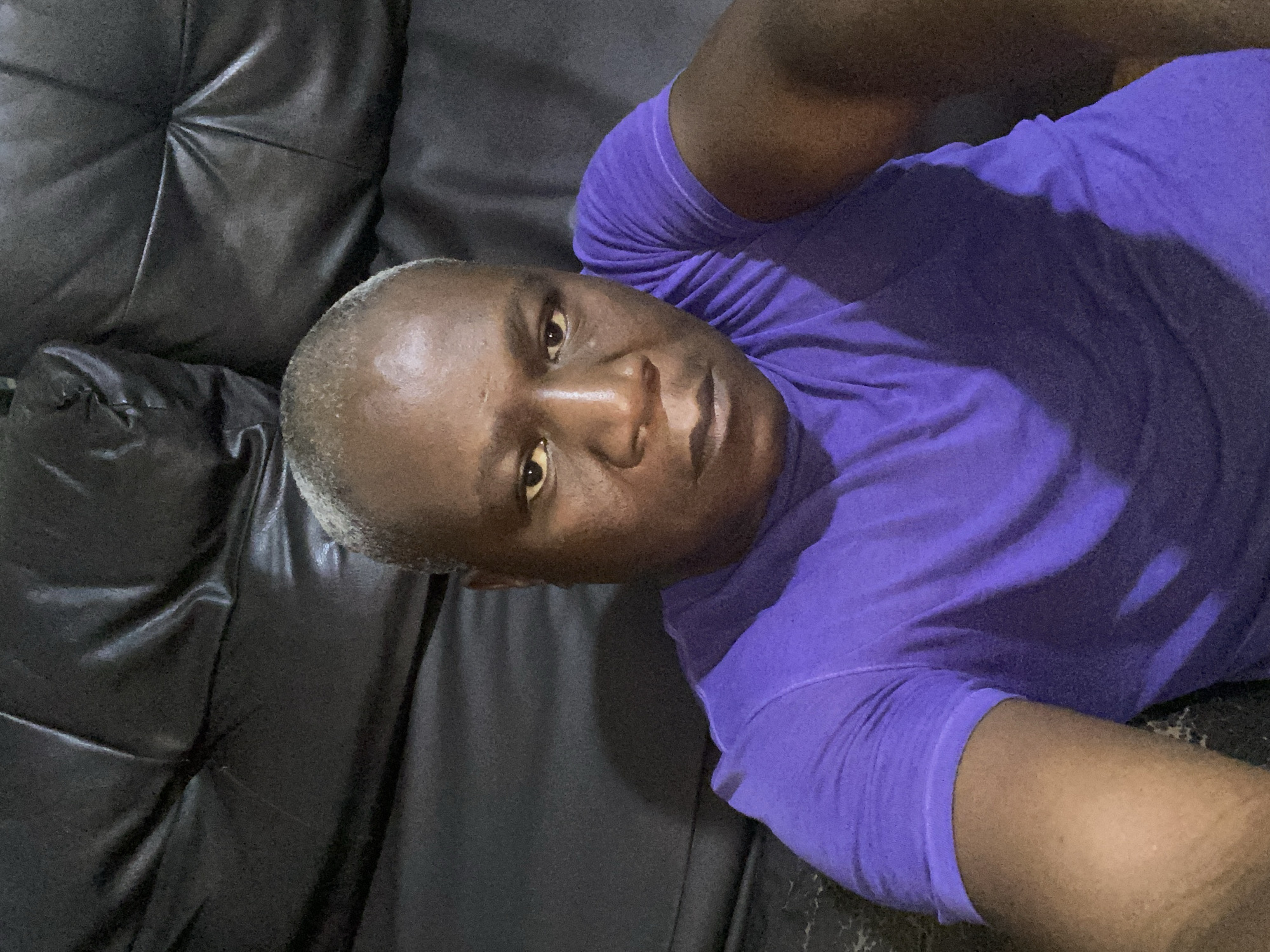 A man lies on a black leather couch. He is wearing a purple t-shirt. The man is facing the camera. The photo was taken indoors. There is no additional information to identify this as being in Kubwa, Nigeria.