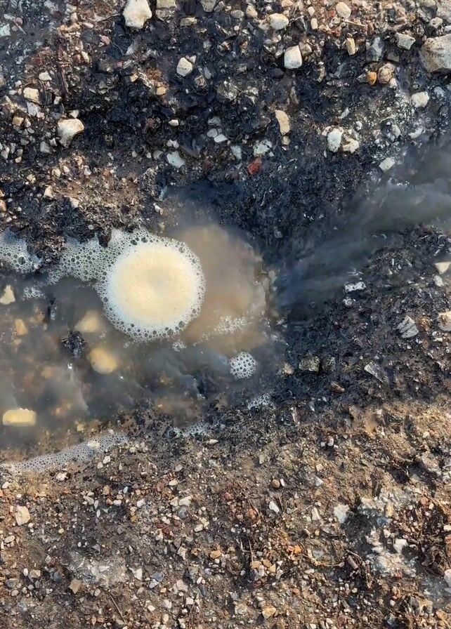 A puddle of muddy water sits amidst a dirt and gravel ground. The puddle contains a foamy, yellowish-white substance in the center, with clear water flowing into it from one side. The ground surrounding the puddle consists of a mix of small rocks, dirt, and patches of black soil. A small section of a white shoe is visible on the bottom left corner of the frame.
