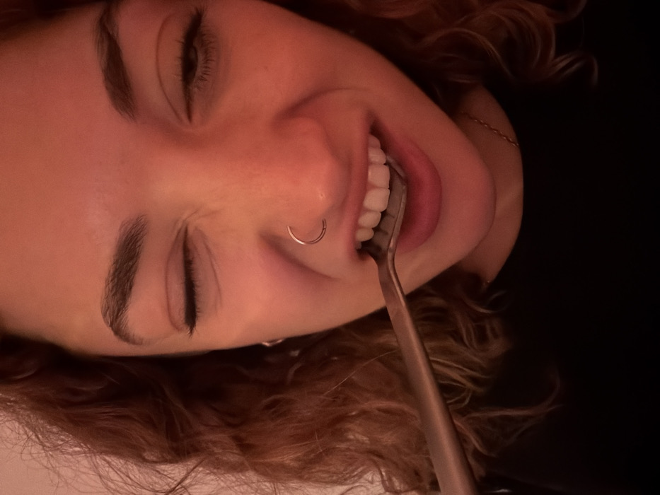- "A person with curly brown hair and fair skin smiles while brushing their teeth" by FM-7EgEk2, licensed under CC BY 4.0
