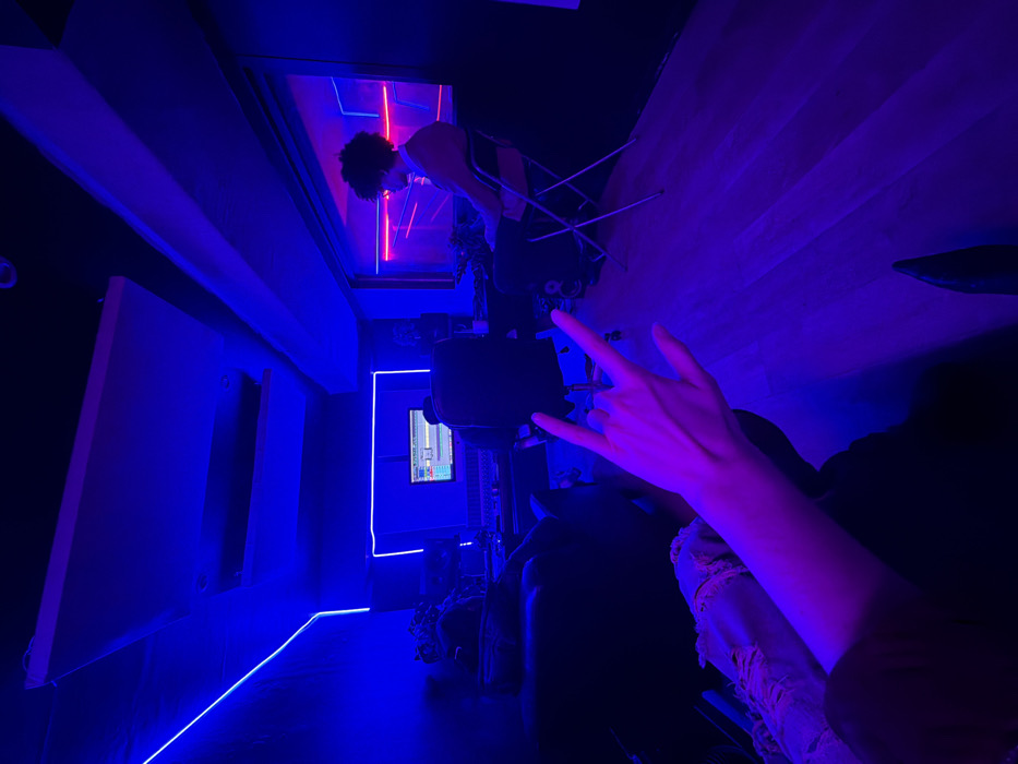 A dimly lit, upside-down room bathed in blue and purple hues. A person stands in a doorway with red neon lights above. In the foreground, a hand throws the "rock on" gesture. An adjacent room has blue neon accents and a small screen displaying graphics. Dark furniture and clothing obscure details, adding to the mysterious, edgy ambiance. The perspective creates a sense of disorientation and artistic expression.