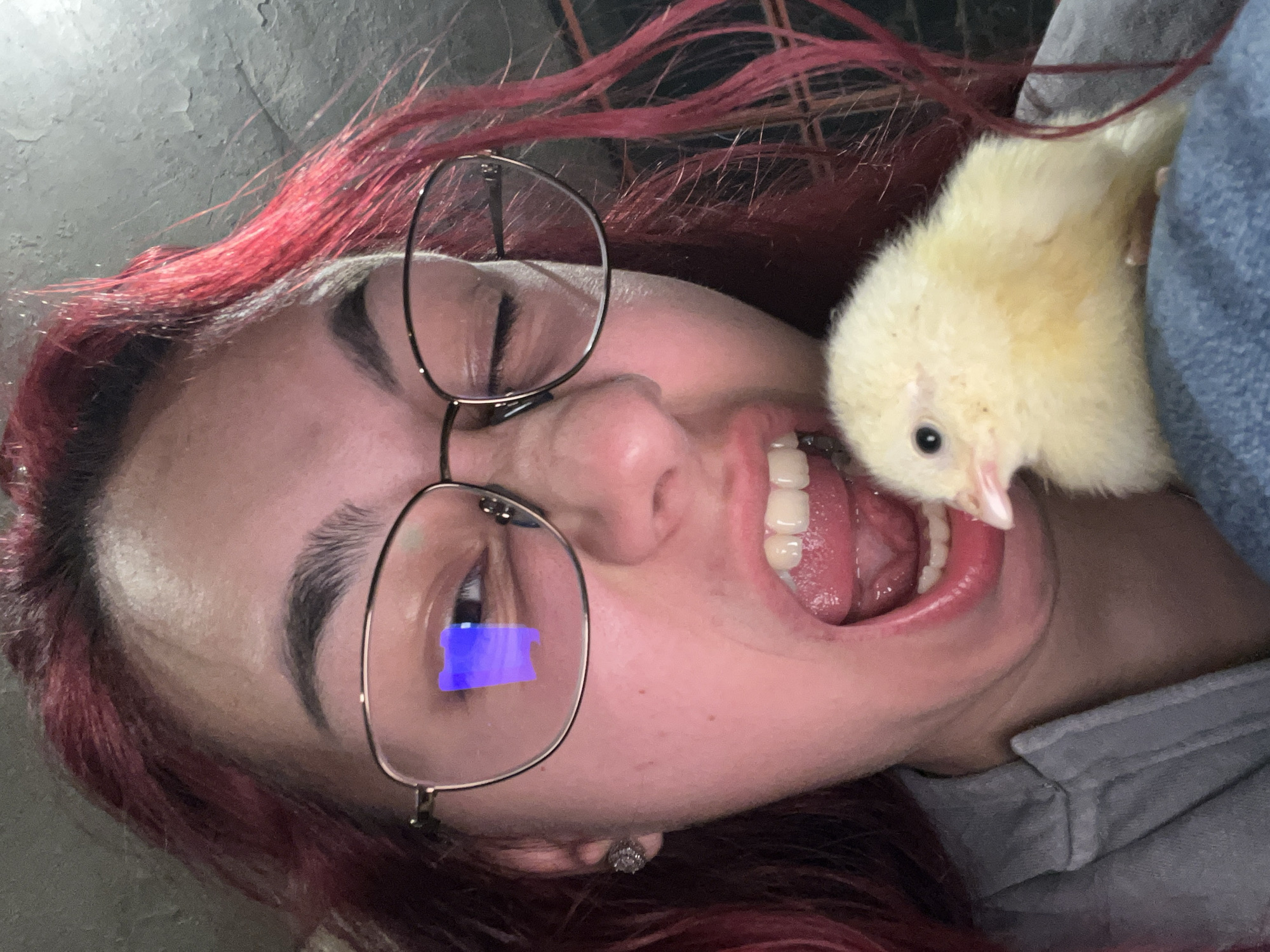A young woman with red hair and glasses lies on her side, mouth open, with a small yellow chick perched near her mouth. She wears a gray shirt. The background is unclear. The scene is indoors. The location is not discernible from the image.