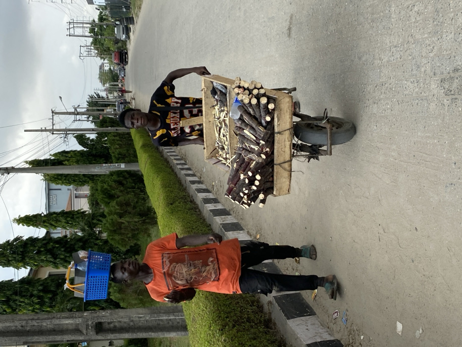 The image depicts a street scene in Ikate, Nigeria, under an overcast sky. Two young adult males are walking along a paved road and an adjacent dirt path. On the left, a male with dark skin wears an orange t-shirt with a graphic design, dark cargo pants, and green flip-flops. He carries a blue plastic basket containing various items, including bottles, balanced on his head, and holds a small, light-colored object in his left hand. To his right, a second male, also with dark skin, wears a black t-shirt with yellow and white patterns, including the word "LUXURY." He pushes a single-wheeled, two-tiered wooden cart heavily laden with cut sugarcane stalks. A plastic water bottle is visible among the sugarcane. The paved road features a black and white striped curb separating it from the dirt path. In the background, a neatly trimmed green hedge lines the path, behind which stand tall evergreen trees and a light-colored building with "PASHA LOUNGE" visible on its facade. Utility poles and power lines are present, and vehicles are seen in the distance on the road.