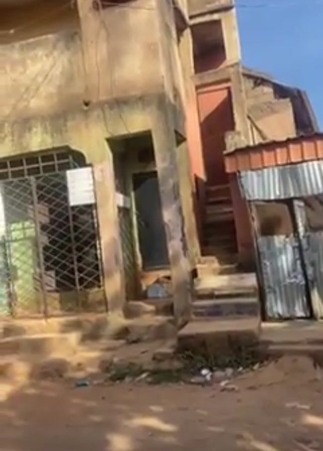 street view of a two-story building with several storefronts. The building's facade is weathered, with peeling paint and a mix of pastel colors on the shopfronts. Metal security bars cover the windows of one of the storefronts. Stairs lead to the upper level. A small, makeshift structure made of corrugated metal sheets stands adjacent to the building. The ground is dirt and scattered with debris. The sky is blue, and the sun casts long shadows across the street. There is background conversation in another language.
