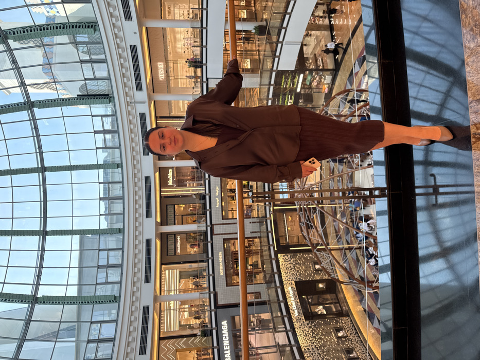 The scene depicts the interior of a multi-story luxury shopping mall, identified as The Dubai Mall in دبي, United Arab Emirates. A female individual stands in the foreground on an upper level, leaning against a brown and glass railing. She has dark hair pulled back, a neutral facial expression, and is wearing a dark brown long-sleeved collared shirt, a darker brown inner top, a dark brown ribbed midi skirt, and light-colored pointed-toe high heels. She holds a light-colored smartphone in her left hand, which rests against her hip, and her right elbow is positioned on the railing. The background reveals multiple levels of luxury retail stores, including Balenciaga, Bottega Veneta, Zimmermann, Max Mara, Versace, and Van Cleef & Arpels. A large, curved glass dome ceiling extends over the mall atrium, through which a clear sky and a distinctive white building with a patterned cupola are visible. Other individuals are present on the lower levels of the mall, engaged in general public movement. The floor in the immediate foreground is dark and reflective.