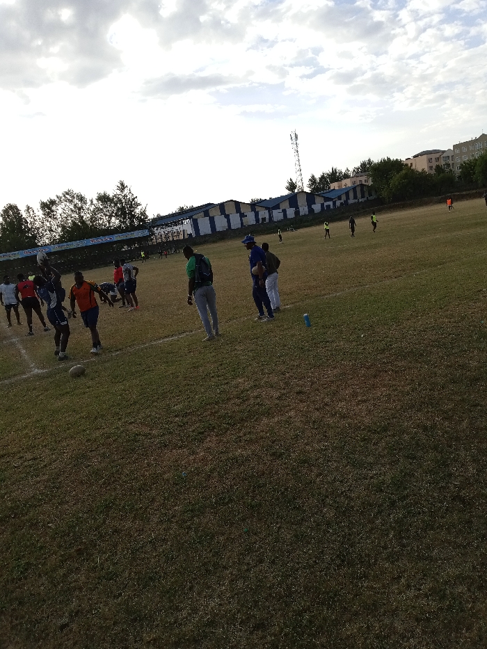 A group of people on a grassy field under a cloudy sky. Some individuals seem to be playing or practicing a sport, possibly rugby, as one person is catching an oval ball. Other people are standing and observing. A building with blue and white accents is in the background, along with some trees. A communication tower is visible behind the building. The field is uneven and patchy.