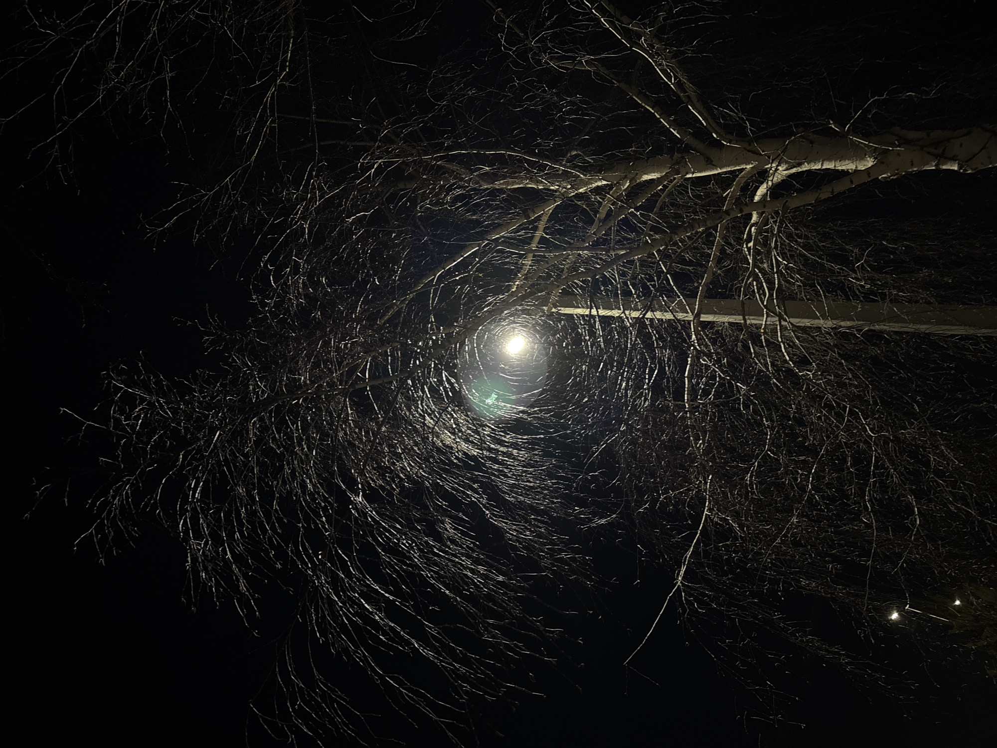 A low-angle view captures the intersection of bare tree branches and a light source against a dark night sky