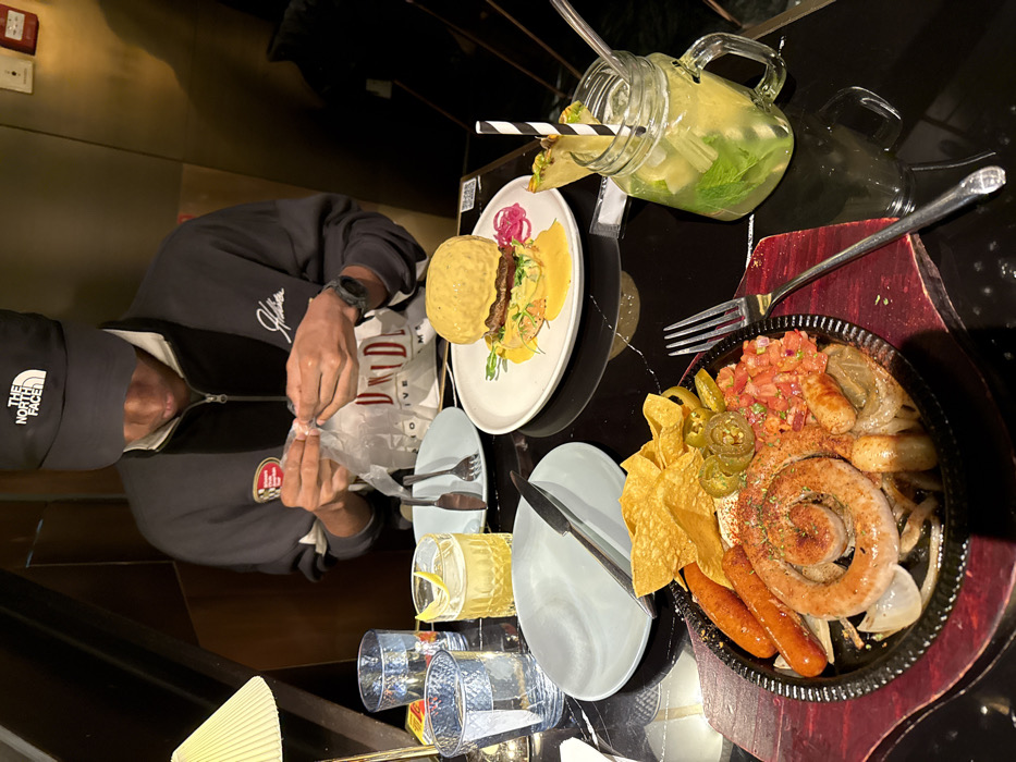 A person is seated at a dark, reflective table in a dimly lit indoor restaurant or bar in Chaoyang District, China. The individual wears a black baseball cap with "THE NORTH FACE" logo and a dark grey zip-up jacket with a white collar and a "Hollister" logo. They are looking down, using both hands to manipulate a translucent plastic bag. A watch is visible on their left wrist. The table is set with multiple food and drink items. In the foreground, a black oval sizzling platter, resting on a red wooden trivet, contains various cooked sausages (including one coiled), tortilla chips, sliced pickled jalapeños, and a fresh pico de gallo-style salsa. To the right of the platter, a clear glass mug holds a yellow-green beverage garnished with mint leaves, lime slices, a black and white striped straw, and a pineapple wedge. In the mid-ground, a round white plate features a gourmet burger topped with a substantial amount of yellow sauce, pickled red onions, and greens. Adjacent to it is an empty light blue ceramic plate with a knife and fork. Two clear, textured glasses filled with water and a third glass containing a yellow liquid with a lemon slice are also present. A white paper bag with partially visible red lettering sits behind the plates. A cream-colored, pleated table lamp illuminates the scene from the left. The background consists of dark walls with subtle geometric paneling.