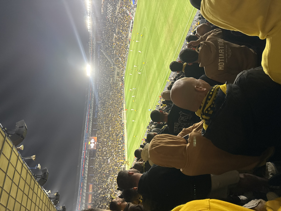 A stadium is packed with spectators, mostly wearing yellow, observing a soccer game on a bright green field. Stadium lights illuminate the field and the crowd. The view is from the stands, looking down at the game. Attendees wear various clothing items including hoodies and scarves. The head of a bald man is visible in the foreground with a yellow and black scarf. The scoreboard shows numbers.