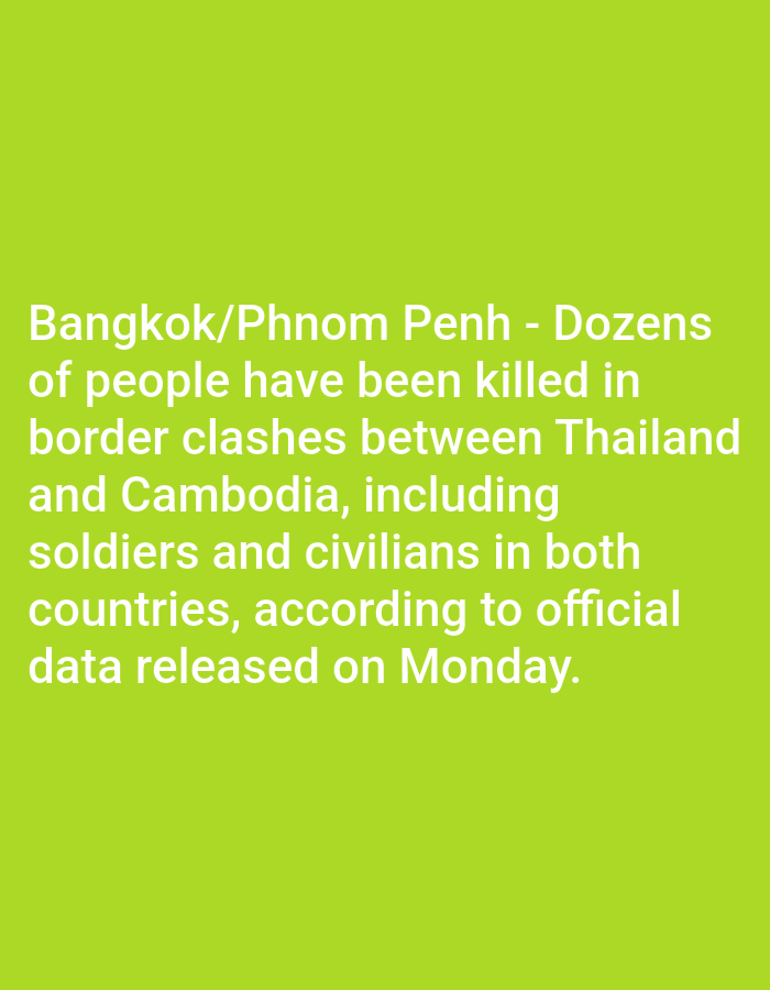 news headline in white text against a lime green background. The headline reports that dozens of people have been killed in border clashes between Thailand and Cambodia. According to official data released on Monday, both soldiers and civilians in both countries are among the casualties. The combined location of Bangkok/Phnom Penh suggests the source or focus of the news report.