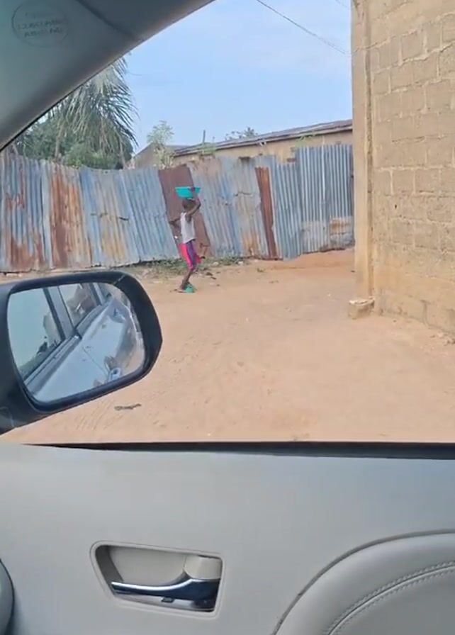 view from inside a car, driving through what appears to be a residential area with dirt roads in an African setting. The car's interior is visible, including the dashboard, side door, and side mirror. Through the window, a young girl wearing a pink shirt and shorts is seen walking in the distance with a blue container balanced on her head. The landscape includes buildings made of brick and corrugated iron sheets. The car seems to be slowly moving forward. The dashboard shows the car's GPS and other system indicators.