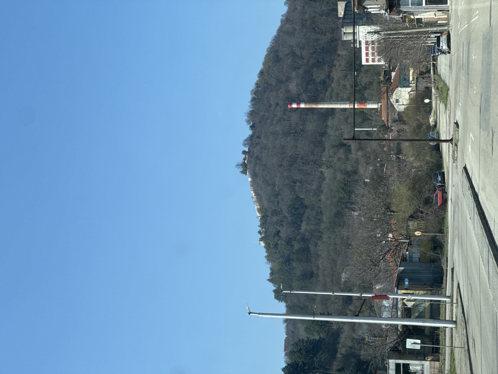 The image depicts an urban street scene in Shumen, Bulgaria, specifically from **ulitsa "Petar Viskov" looking northeast towards the Shumen Plateau**. The upper portion of the frame is dominated by a clear, bright blue sky. In the background, the heavily forested Shumen Plateau rises prominently. Its deciduous trees appear mostly bare, suggesting late winter or early spring. Structures, including what appear to be parts of the Shumen Fortress or associated historical buildings, are visible on the crest of the plateau, interspersed with trees and a visible white facade or wall. The mid-ground features a mix of industrial and residential architecture. A tall, slender industrial chimney, painted with alternating red and white horizontal stripes, stands prominently to the right of the center, indicating the former Shumen Brewery (now Kamenitsa brewery) area. To its right, a multi-story white building with red window frames and other industrial structures are visible. Below and to the left of the chimney are various older, predominantly residential or light industrial buildings with tiled roofs, some appearing dilapidated. Sparse trees and shrubs with bare branches are scattered throughout this section. The foreground shows an asphalt road intersection. The road surface exhibits signs of wear. Two modern, multi-fixture streetlights are positioned on the left side of the frame. Several road signs are visible, including a white square sign, a yellow diamond sign, a blue directional sign with a white right-pointing arrow, and an orange circular sign. On the left, a partially dilapidated building with large windows and corrugated metal annexes stands beside the road. A red compact car is parked on a grassy verge further left. On the right side of the road, a silver Volkswagen Golf VII is parked, facing away from the viewer, with another dark vehicle behind it. No individuals are visible within the scene.
