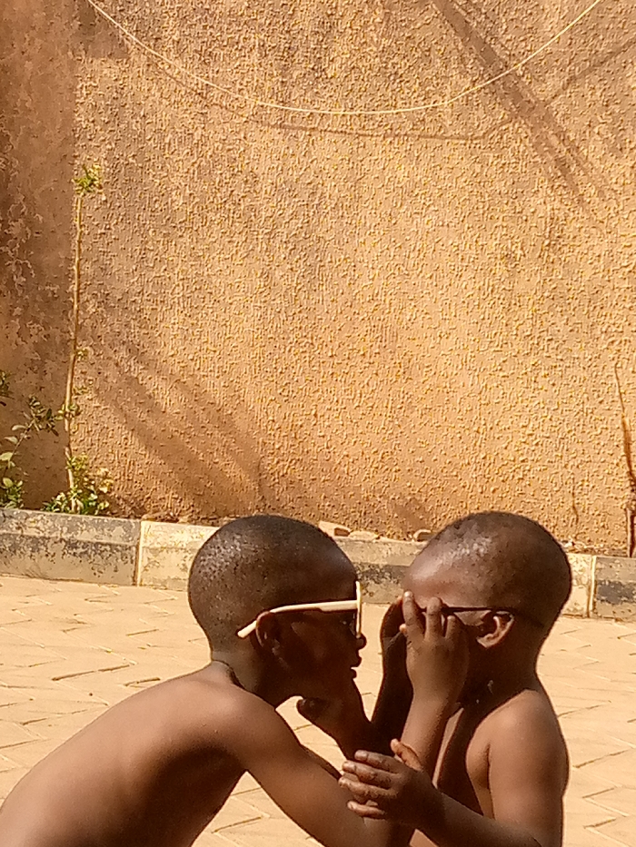 Two young, dark-skinned children are positioned outdoors in Sabon Tasha, Nigeria, under strong sunlight. The child on the left is shirtless, wearing white-framed sunglasses pushed onto their forehead, and is partially bent forward, looking towards the child on the right. Their left hand appears to be near the other child's neck or chin. The child on the right is also shirtless, wearing dark-framed sunglasses, and has both hands raised, partially covering their eyes and sunglasses. They are facing the child on the left. The ground consists of light brown or tan interlocking paver blocks. In the background, a light brown, textured stucco or rough-plastered wall rises, with a thin green sapling and small green plants growing along its base. A concrete curb or planter box runs horizontally at the base of the wall. A light-colored wire is visible stretched across the upper portion of the wall. Shadows are cast by the children and unseen objects onto the wall.