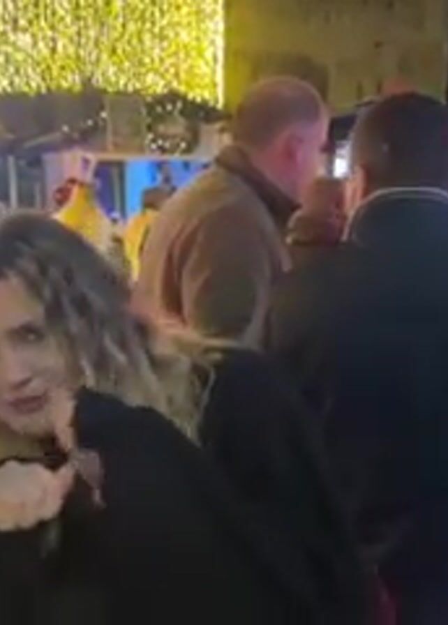 young woman with blonde, wavy hair dancing in what appears to be a Christmas market or festive outdoor gathering. She is wearing a black hooded sweatshirt and smiles at the camera while moving her arms and body to the music. Behind her, several people stand and chat, creating a bustling background. The scene is illuminated by strings of lights and festively decorated booths. Some people are seated at tables, drinking and socializing. The lighting is warm, lending a celebratory feel to the scene.