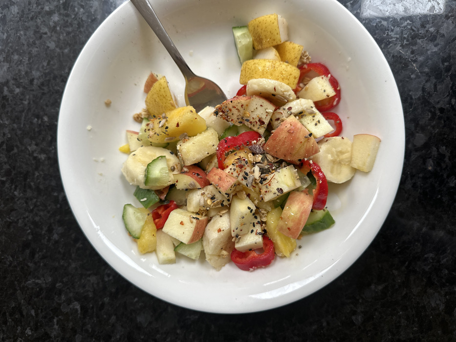- "The image displays a white, round ceramic bowl containing a mixed fruit and vegetable salad, positioned on a dark, speckled countertop" by FM-13LyK2, licensed under CC BY 4.0