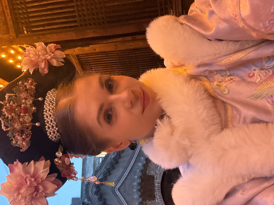 A woman in elaborate historical clothing poses for a selfie. She wears a black headdress adorned with pink flowers and pearl-studded ornaments. A light purple garment with white fur trim is draped over her shoulders. The background features a lit structure above and a stone building below, creating an outdoor setting.