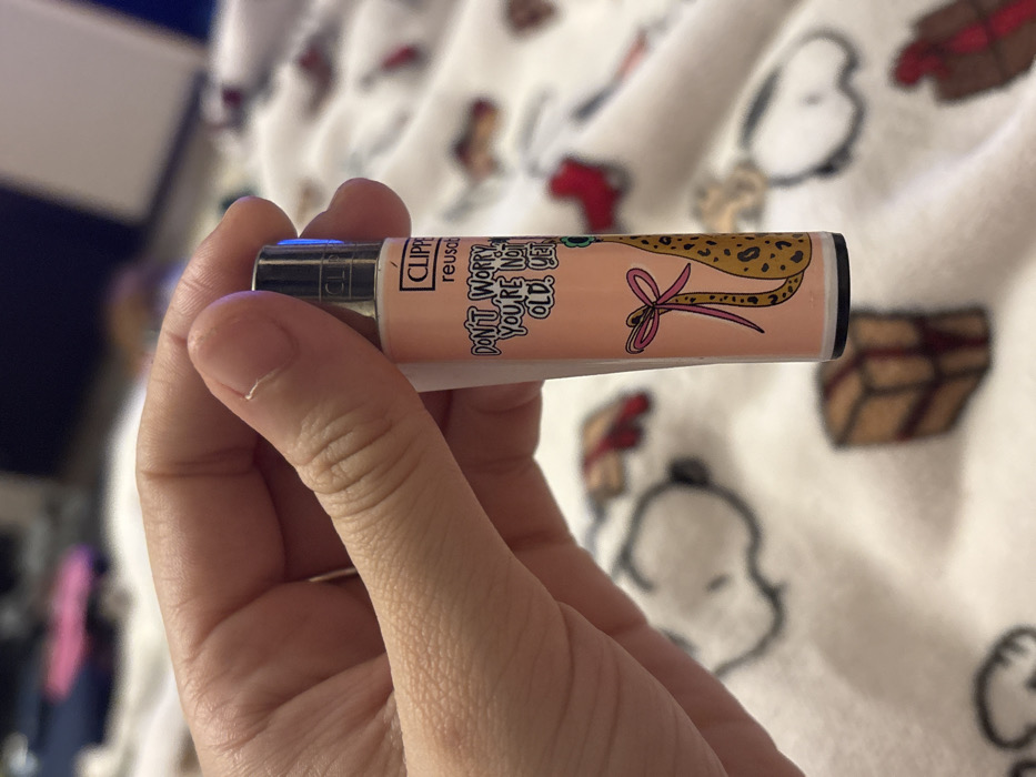 A light-skinned human hand holds a peach-pink Clipper reusable lighter, oriented vertically. The lighter features a silver metallic top. Text on the lighter reads "CLIPPER reusable" and "DON'T WORRY, YOU'RE NOT OLD! YET!". Below the text is an illustration of a brown leopard-print high-heeled shoe adorned with a pink bow. The hand shows visible skin creases, with a minor, light-colored irregularity on the index finger's cuticle area. The background is a blurred, light-colored textile surface, possibly a blanket or sheet, patterned with indistinct cartoon graphics, including representations of the character Snoopy and stylized gift boxes. The scene is located indoors in Sofia, Bulgaria.
