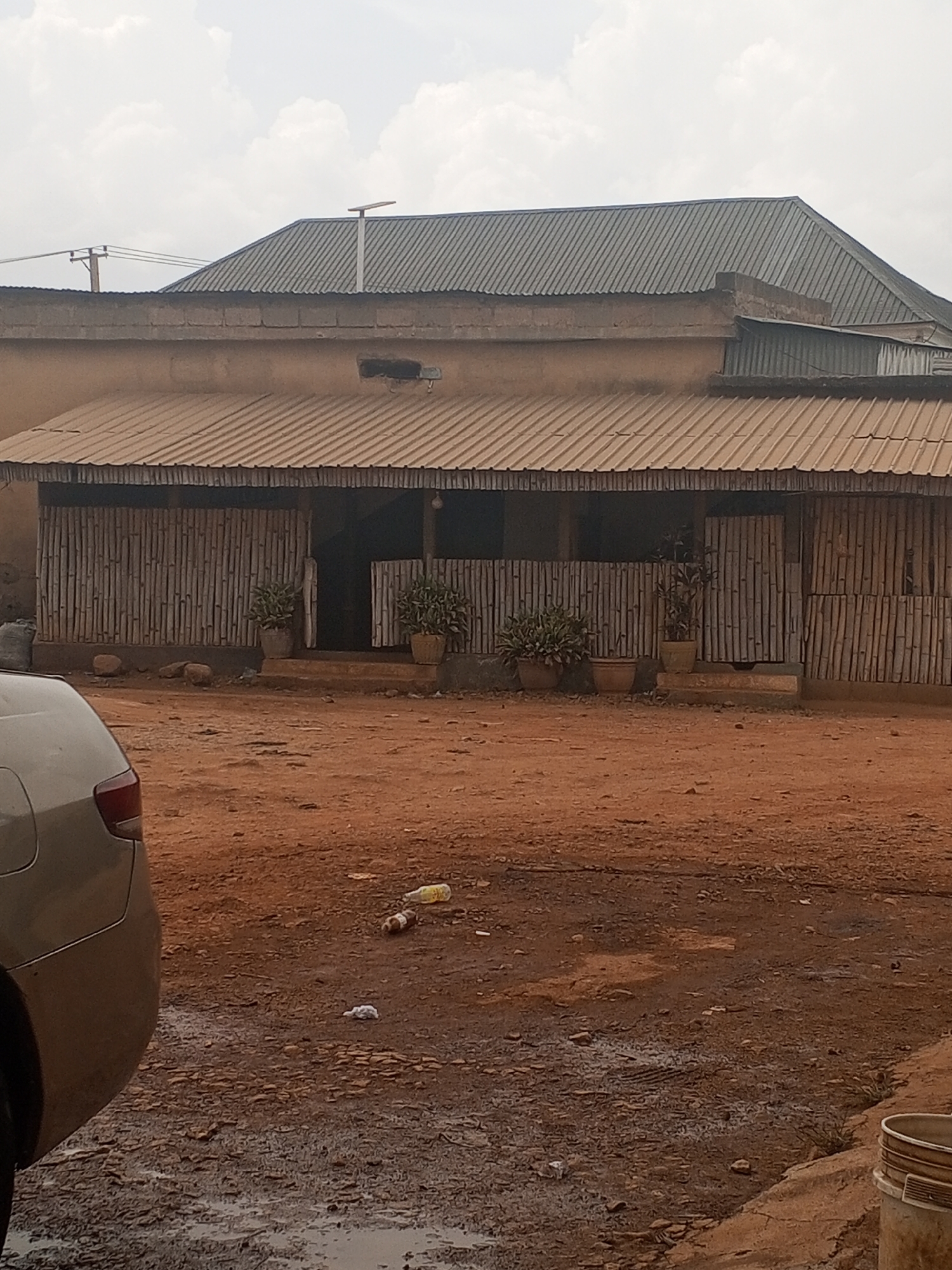 This image depicts an exterior scene in Gura Top, Nigeria, featuring a single-story building and an unpaved foreground under an overcast sky