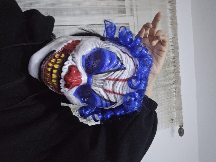 A person in a black hoodie holds a sinister clown mask with blue hair. The mask's right side features a blood-red cavity exposing yellow teeth, while the left displays blue mesh eyes and white and red stripes. A hand is visible near the mask, against a backdrop of a sheer, light-colored curtain and a white wall. The image's angle is slightly skewed, presenting a tilted perspective.