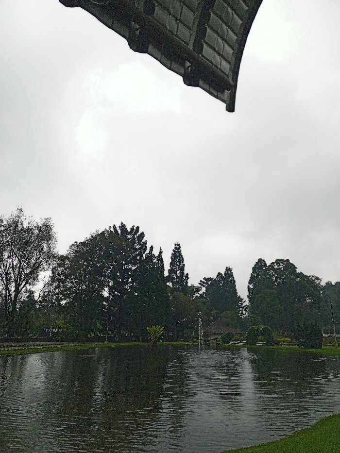 An overcast sky hangs over a tranquil lake reflecting the dark green trees lining its perimeter. A fountain sprays water in the middle of the lake, and a glimpse of a building is visible amidst the trees. A dark, tiled roof structure occupies the top part of the frame, appearing to be above and out of focus. The scene depicts a peaceful, rainy day at a garden or park.