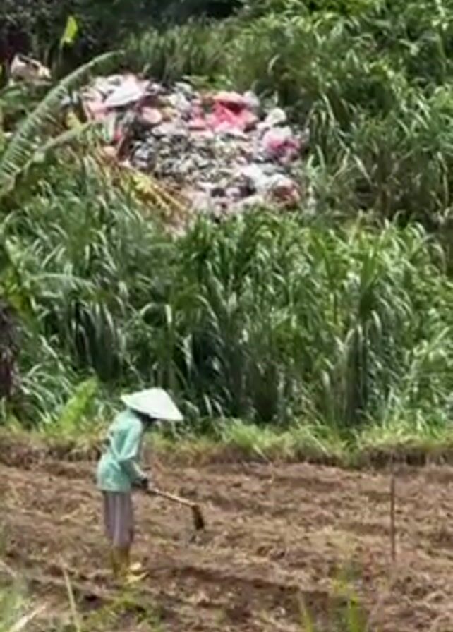 A woman wearing a conical hat and light green clothing is working in a field. She is using a hoe to till the soil. Behind her, a small hill is covered with tall green grass and other plants. A large pile of garbage is visible amidst the greenery on the hill. The sky is bright and the scene appears to be set in a rural or agricultural area.