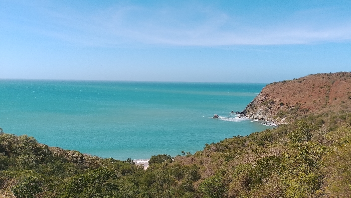 The image presents a panoramic coastal scene located in Pedro González, Venezuela. The upper third of the frame is occupied by a clear, light blue sky with a faint band of high haze near the horizon. Below the sky, the turquoise-blue ocean extends across the middle ground, displaying a textured surface from light reflections or ripples. On the right side, a reddish-brown hill, sparsely covered with scrub vegetation, descends sharply into the ocean, forming a prominent headland. Rocks are visible at the base of this landmass where it meets the water, with waves breaking against them. The foreground and lower left portion of the image are densely covered with varied green and brown low-lying vegetation, indicative of scrubland, which slopes towards the water. In the central lower section, a small stretch of light-colored sand, appearing as a beach, is visible at the edge of the bay, where gentle waves are breaking. No individuals, animals, or artificial structures are discernible within the frame.