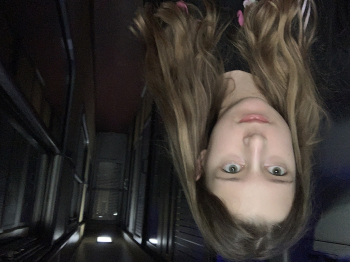 An upside-down portrait of a young woman with shoulder-length blonde hair and blue eyes. The background suggests an enclosed hallway with metallic walls and a door at the far end. The woman's face is central, with her hair framing the top of the image. There are hair accessories on the top part of her head. The lighting in the hallway is dim, with bright spots near the floor. The overall impression is surreal and distorted due to the inverted perspective.