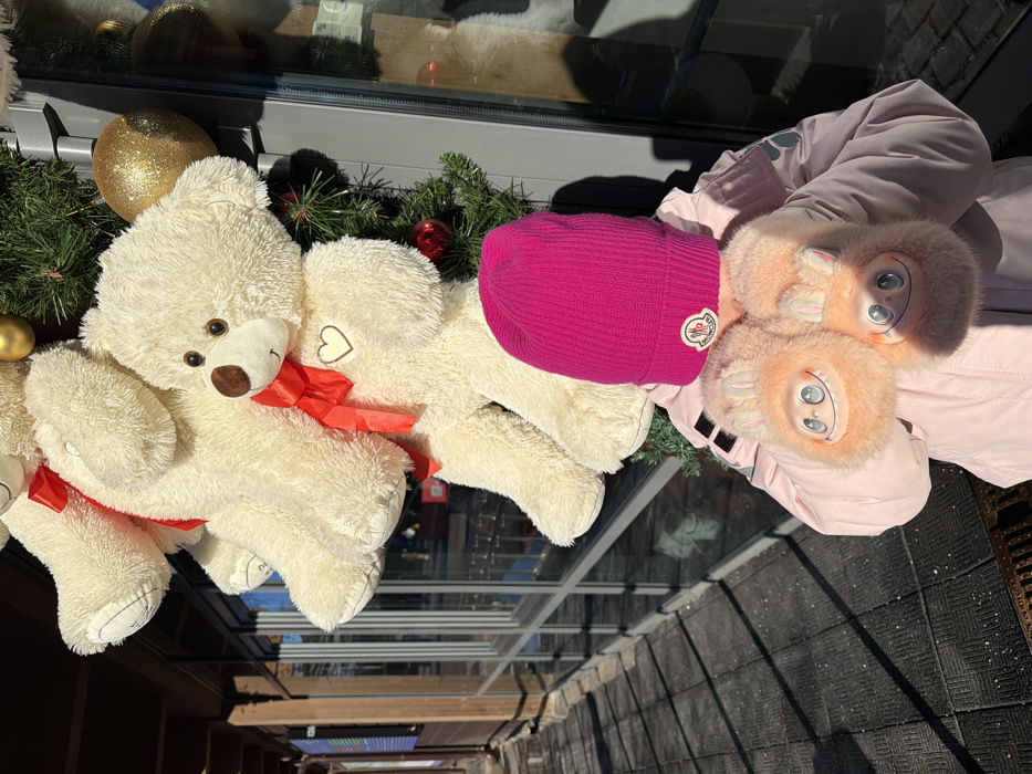 An individual is depicted outdoors in Mistolovo, Russia, positioned in front of a building facade. The subject is partially visible from the chest upward, oriented with their back towards a glass storefront. They wear a bright pink ribbed knit beanie featuring a white circular Moncler logo patch on the front. A light pink puffer jacket covers their torso. The subject's hands are encased in large, fluffy, peach-colored mittens, which are adorned with cartoonish smiling faces, small bunny-like ears, and metallic-toned eyes. Behind the individual, three large, cream-colored plush teddy bears are suspended vertically, forming a decorative arrangement. Each visible bear wears a red ribbon tied in a bow around its neck and features a small white heart embroidered on its chest. These bears are integrated into a green artificial garland, which is further decorated with red and gold spherical ornaments, including a prominent glittery gold bauble. The background features a building with large, reflective glass windows, indicating a commercial establishment, and a dark wooden structure visible on the left. The ground is paved with dark, textured material, and strong sunlight casts distinct shadows across the scene. A drain grate is visible on the ground in the foreground.