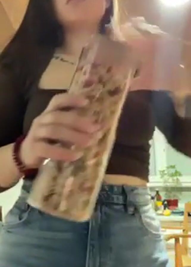A woman pours cereal from a tall, clear container into a tan-colored bowl