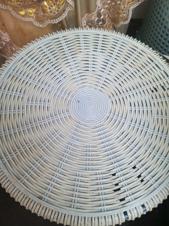 The image presents a close-up, top-down view of a circular, light blue woven object, located in Qarabucaq qəsəbə, Azerbaijan. The object, possibly a tray or stool top, features a concentric circular weaving pattern intersected by radial strands, forming a uniform grid. The material appears to be painted wicker or a similar synthetic fiber. The object exhibits minor surface wear, including dark specks and visible breaks in the woven strands along its right circumference. A raised, ridged perimeter borders the main woven surface. In the upper background, a draped textile with golden and white lace patterns is partially visible, suggesting an indoor setting. To the far right, a portion of a second light blue object, appearing to be a plastic basket with a distinct grid pattern, is partially visible. The immediate surface supporting the main object is dark and out of focus. No individuals, actions, or direct interactions are depicted.