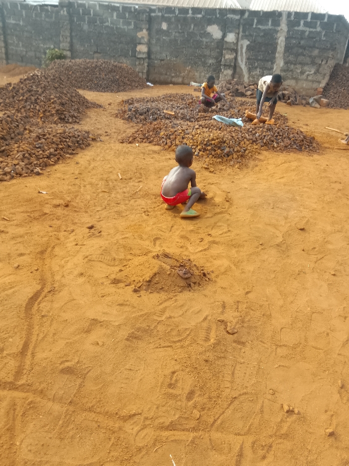 Three children are present in an outdoor dirt area alongside piles of material resembling rocks or construction debris. A child in red shorts sits in the foreground. Two other children are further back, one kneeling and one standing, seemingly working amidst a pile of the material. A weathered gray brick wall borders the background.