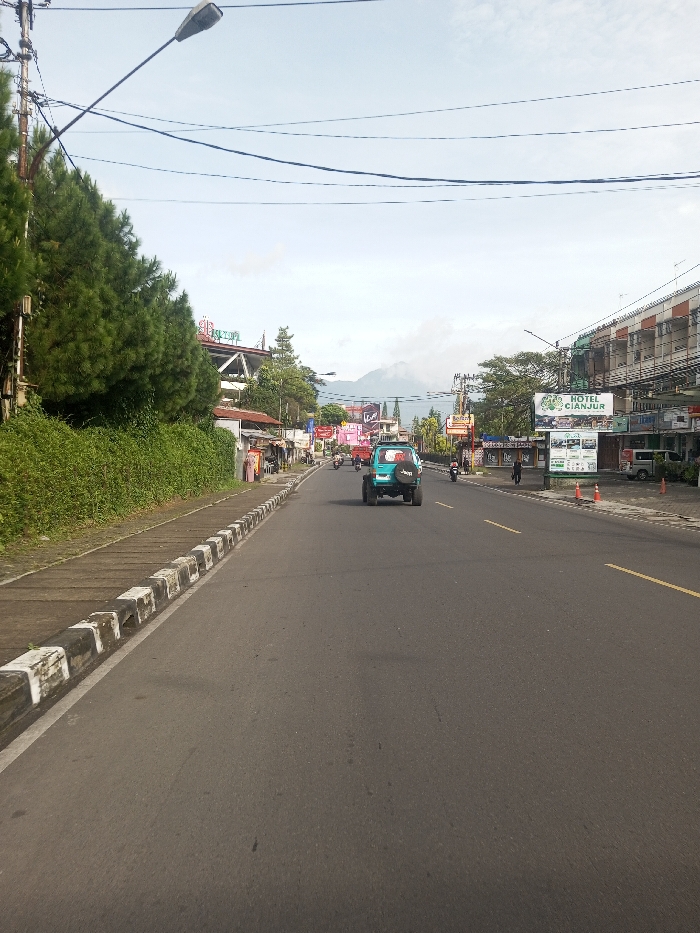 The image depicts a two-lane asphalt road viewed from a low angle, extending into the distance under an overcast sky. The confirmed location is Cianjur, West Java, Indonesia, indicated by a prominent "HOTEL CIANJUR" sign. The road features a yellow dashed center line and a white solid line marking the right edge. On the left, a paved sidewalk is bordered by black and white painted concrete curbs. Adjacent to the sidewalk is a dense, manicured green hedge, behind which are several large evergreen trees and multi-story buildings, including one with a visible green sign featuring red text. A utility pole with a street light extends over the road from the left foreground. In the right lane, a teal-colored Suzuki Jimny-style SUV, with a spare tire cover marked "Jeep" at the rear, is traveling away from the viewer. Further down the road, additional vehicles, including motorcycles, are visible. The right side of the road features a paved shoulder with two orange traffic cones positioned near the edge. A row of multi-story commercial buildings lines this side, one prominently displaying a large green sign for "HOTEL CIANJUR." A single pedestrian is walking on the right side of the road near these buildings, and a white van is parked further ahead. In the distant background, hazy mountains are visible beneath the light blue, cloud-strewn sky. The scene is illuminated by ambient daylight, casting minimal shadows.