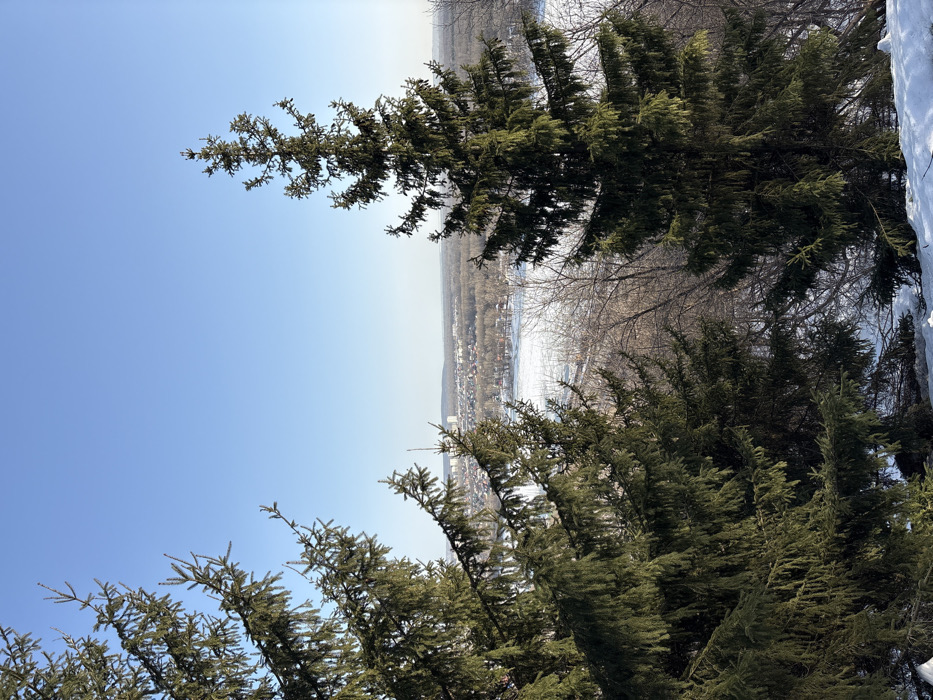 The image displays an elevated winter panorama from the high right bank of the Belaya River in Ufa, Russia. The foreground features snow-covered ground and dense evergreen trees, specifically spruces or firs, framing the view on the left and right, with additional smaller evergreens and bare deciduous branches in the mid-distance. Beyond this vegetation, a wide, flat expanse of the frozen Belaya River, covered in white ice and snow, stretches horizontally. On the far bank of the river, a sprawling urban area is visible, characterized by numerous low to mid-rise residential and commercial buildings, with a few taller, lighter-colored structures prominent in the distance. A faint treeline marks the horizon beyond the city. The sky above is clear, uniformly bright blue, and cloudless, indicating a sunny winter day. No human figures, animals, or specific activities are discernible within the frame.