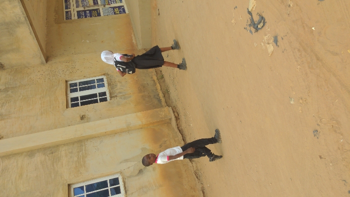 Two children in school uniforms stand outside a building. The girl is wearing a black skirt, white top, backpack, and a white headscarf. The boy has on black pants and a white top with pink trim. The building has windows with white frames. The ground is sandy. The angle of the shot is rotated so the image is displayed sideways.