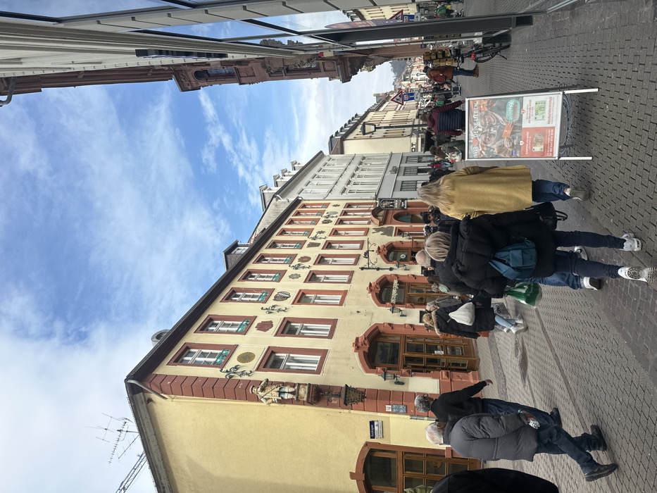 street in Heidelberg, Germany (latitude: 49.411, longitude: 8.701). The street is lined with buildings, most of which are several stories tall and have a yellow facade with red accents. The buildings are decorated with numerous ornaments, including coats of arms and statues. The street is relatively narrow and there are people walking in both directions, some carrying bags or purses. Some people are standing in groups talking, while others are walking alone. There is a sign on the sidewalk advertising a local bar or restaurant. There are also a few bicycles parked on the sidewalk and a large building in the background. The sky is blue with some white clouds. The street appears to be cobblestone. The scene suggests a typical day in the city of Heidelberg.
