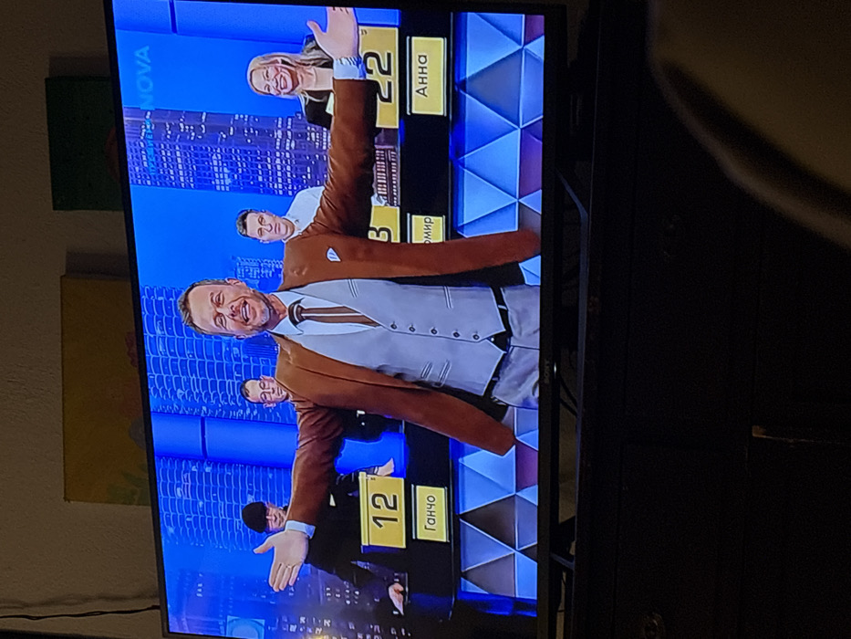 A flat-screen television displays a live broadcast of a game show or quiz program