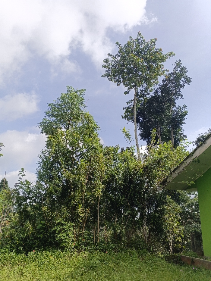 The image depicts a verdant, outdoor scene, characteristic of a humid, vegetated environment, stated to be in the city of Nanlao, China. The upper half of the frame is dominated by a partly cloudy sky, featuring white and light grey clouds against a light blue background. Below the sky, numerous trees with dense green foliage occupy the majority of the image. Prominently, several tall, slender trees with visible trunks rise vertically. One particularly tall tree, slightly right of center, exhibits a full crown of green leaves. To its left, another tall tree also displays a dense canopy. The lower two-thirds of the image consist of thick, unruly green vegetation, including numerous bushes, smaller trees, and ground cover, suggesting a natural or unkempt area. On the far right, the upper corner of a man-made structure is visible. This structure features a bright green wall and a light-colored, possibly off-white or pale grey, roof overhang or eave. Green foliage, appearing to be vines or small plants, is growing on and over this roof edge, indicating either neglect or intentional greening. No people, animals, or specific actions or interactions are visible within the frame. The overall impression is one of lush, overgrown greenery under a partly cloudy sky.