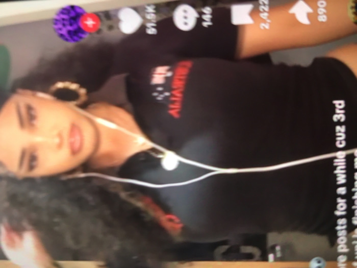 A woman with curly hair and large hoop earrings looks at the camera. She is wearing a black shirt with red lettering. There are white earbuds hanging from her ears. The woman is on what appears to be TikTok, with social media icons displayed around her. The top right corner shows icons of likes, comments, and sharing. The number of likes is listed as 51.5k.