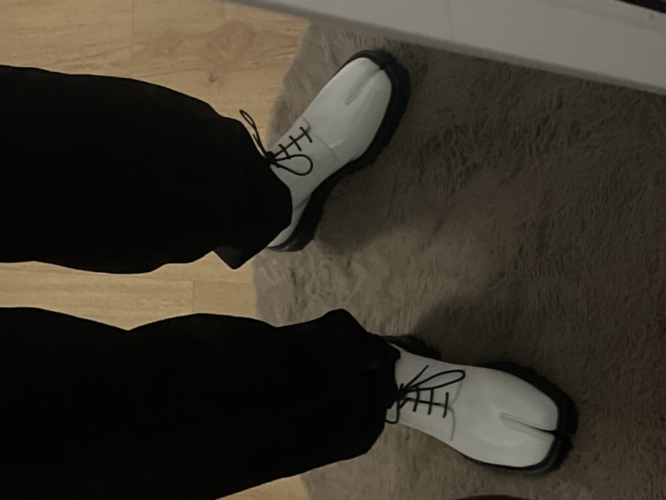 The image showcases a person wearing black pants and white, split-toe shoes
