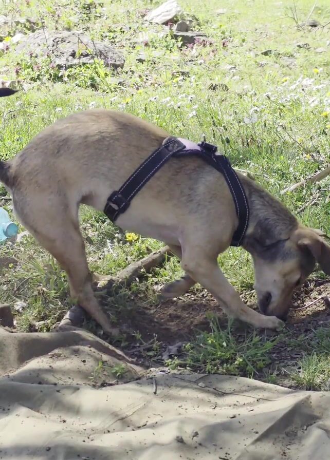 A dog with a brown coat and a black harness is digging in a grassy area with its nose in the dirt. The dog kicks up some dirt with its front paw as it digs. There is a green tarp visible in the foreground. In the background, there is green vegetation, wildflowers, rocks, and bare trees. The lighting suggests it is daytime.