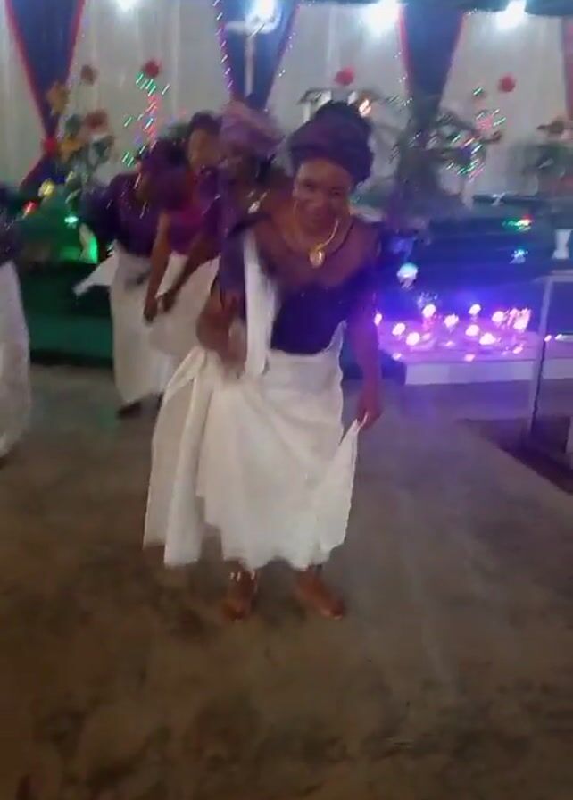 Four women are performing a dance in what appears to be a church or hall. They are dressed in matching outfits consisting of a purple sequined top, a white wrapped skirt, and a head wrap. The lead woman is looking towards the camera as she dances. Behind them is a raised platform with decorations, including flowers and lights. The floor is concrete and appears slightly uneven. The lighting in the room is a mix of bright overhead lights and colored lights.