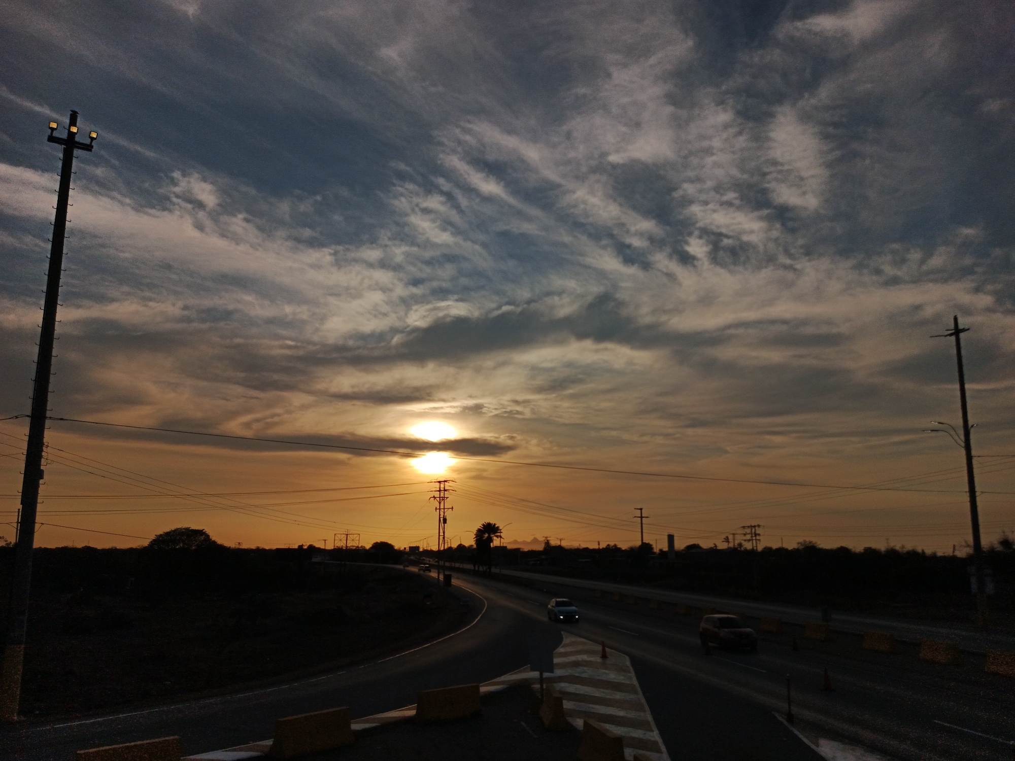 A road curves through El Dátil, Venezuela, under a dramatic sunset sky streaked with clouds. Power lines crisscross the sky between utility poles on either side of the road. Two cars are visible on the road, one headed toward the viewer. Yellow traffic barriers line the road. The sun, partially obscured by clouds, creates a bright spot on the horizon. Silhouetted vegetation lines the horizon. A tall street light stands prominently on the left.