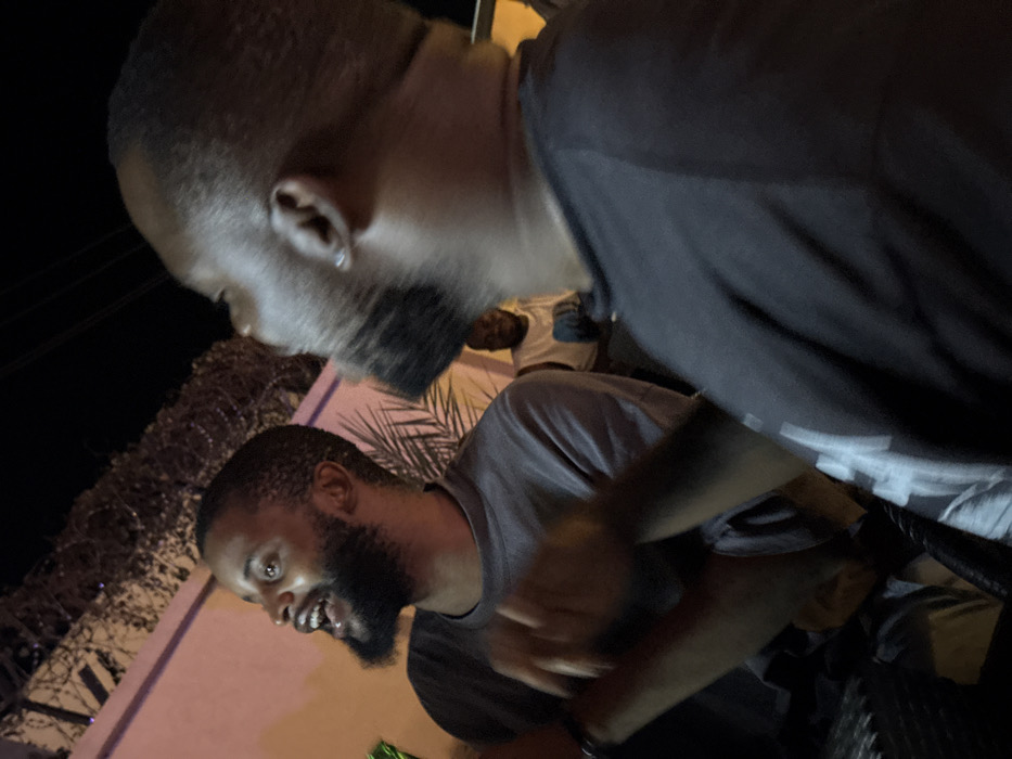 A nighttime image from Lugbe, Nigeria, depicts three males under artificial illumination. In the mid-ground, a man with a dark beard and short hair, wearing a grey t-shirt, is visible from the chest up, oriented partially to the right. His mouth is open, and his gaze is directed upwards and to the right, consistent with an active expression. His right hand is visible in motion, and a green object is partially visible near it. The foreground presents a blurred, partial view of another man's back and left shoulder, wearing a dark t-shirt. An earring is discernible in his left ear. In the blurred background, a third man is partially visible, appearing to wear a light-colored sleeveless garment. The background environment consists of a light-colored wall topped with coiled razor wire, with dark foliage, possibly palm fronds, silhouetted against the night sky.