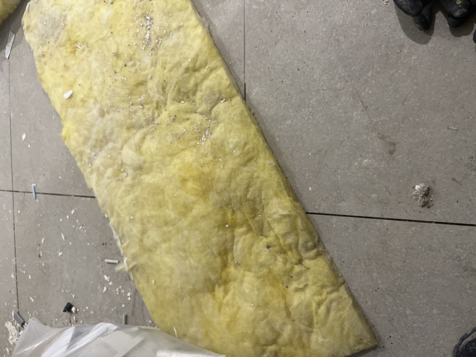 A forensic examination of the image reveals a close-up perspective of a construction or renovation site in Sofia, Bulgaria. The primary subject is a large, irregularly shaped segment of yellow fibrous insulation material, consistent with mineral wool or fiberglass, occupying the majority of the frame from the lower left towards the upper right. Its surface is visibly soiled with various particulates, including white dust, small white fragments, and darker specks. The insulation rests directly on a light grey tiled floor, characterized by visible dark grey grout lines forming a grid pattern. Scattered across the tiles, particularly in the upper left and lower right sections, are various pieces of construction debris: numerous small white plaster or drywall fragments, general dust, and at least one white plastic wall plug (dowel) clearly visible near the upper center. In the upper left quadrant, a crumpled translucent white plastic bag containing additional refuse is partially visible. The lower right corner of the frame shows a portion of a dark-colored object, consistent with a work boot or glove. No individuals or active interactions are depicted. The scene suggests an area undergoing demolition, installation, or post-construction cleanup.