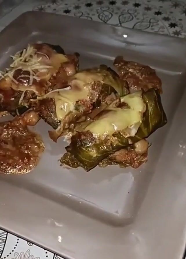 A plate of stuffed cabbage rolls is shown in the video. They appear to be covered in melted cheese and sauce. One roll is also topped with shredded cheese. The plate is rectangular and light gray in color. The background features a tablecloth with a black and white pattern.